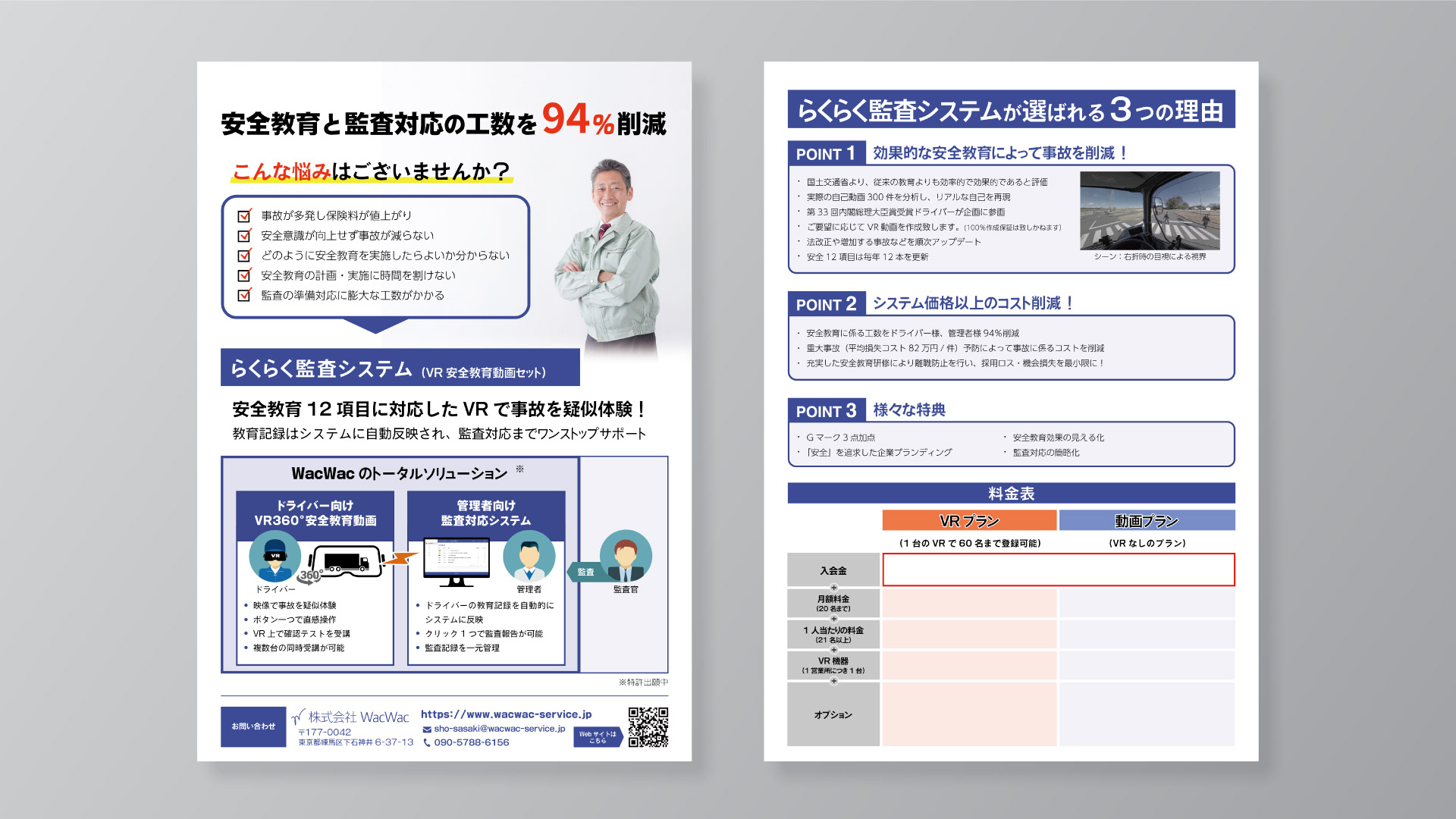 株式会社WacWac様がリリースした物流会社向けVR安全教育システムの紹介フライヤーを制作しました。